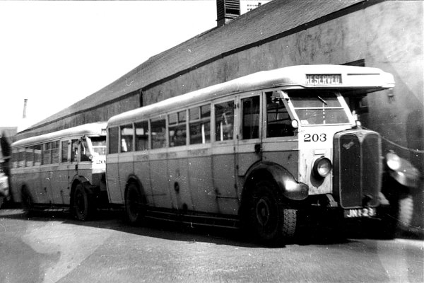 Southend AEC Regal/English Electric single deckers 203 (front, JN823) and 204 (back, JN824) at the Corporation depot, probably in 1951.