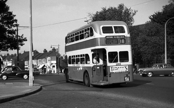 Rear view of Southend AEC Regent III 261, EHJ445, showing clearly the curved windows either end of the lower deck.