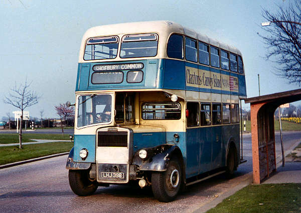 Southend Corporation 296, LHJ398, a Leyland PD2 with Massey bodywork new in 1955. Looking rather tired, 296 works a Shoebury Common 'J' schedule working shortly before being replaced by the imminent arrival of the first Daimler Fleetlines.