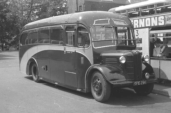 MPE296 was a Plaxton C29F bodied Austin CXB dating from June 1948 and was seen in Onslow Street Bus Station in Guildford with Tillingbourne Valley, Gomshall who acquired it from Graves, Redhill, its original operator.