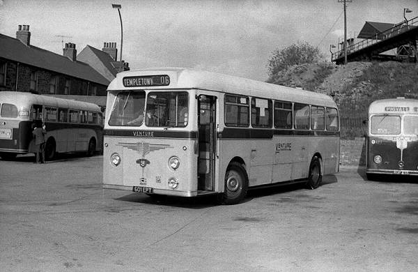 208, 601EPT new in 1959 carried the last Willowbrook body supplied to Venture. B45F bodywork was carried by the Leyland Tiger Cub which was seen at the Garage.