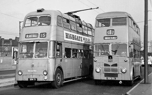 Walsall trolleybus 871, XDH71, a Willowbrook-bodied Sunbeam F4A, passes 131, ODH89, a full-front Park Royal-bodied Leyland PD2/1 of 1951.