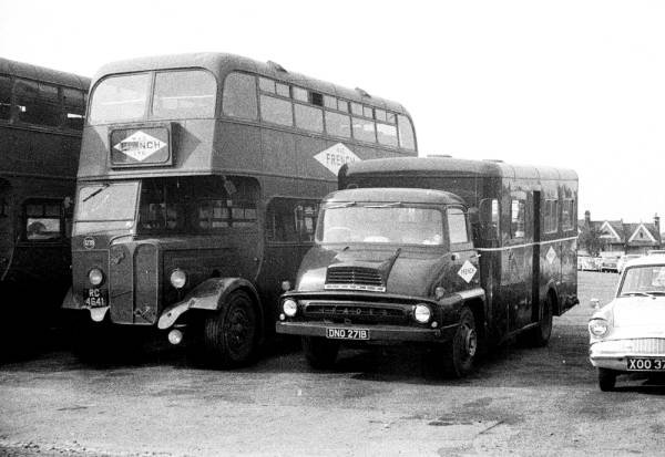 Two vehicles in the W&C French fleet, RC4641, 1937 AEC Regent with post-war Willowbrook L55R body, ex-Trent, and DNO271B based on a Ford Thames Trader lorry chassis.