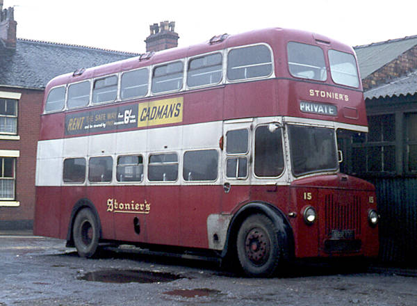New in 1954 as East Midland D105, RRR105 was a Leyland PD2/20 with a Metro-Cammell L27/28R body. It was acquired by Stonier, Goldenhill in January 1967 and became number 15.