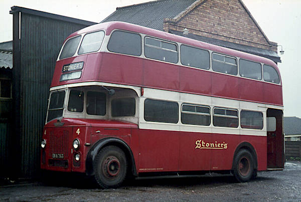Stonier, Goldenhill 4, RVA763, seen here at the Stonier garage in High Street, Goldenhill, was a Leyland PD2/30, with a Northern Counties L31/28RD body. It had been acquired in June 1966 from Hutchison, Overtown, to whom it had been new in 1958.