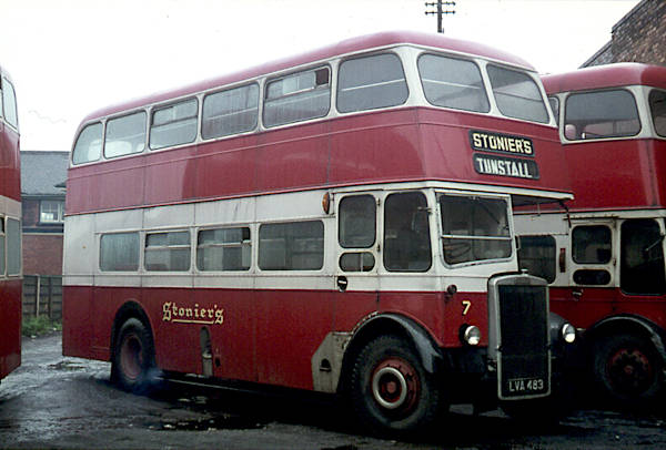 LVA483 was a Leyland PD2/12 which had been new in 1955 with a Northern Counties L27/28RD body. It is seen at the Stonier garage in High Street, Goldenhill, having been acquired in August 1965 from Hutchison, Overtown, and was withdrawn in November 1972.