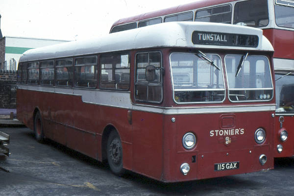 Stoniers 115GAX was a Leyland Leopard PSU3/3R new with Willowbrook DP51F bodywork, but it looks to have later been fitted with bus seats. It was purchased from Jones, Aberbeeg in 1966.