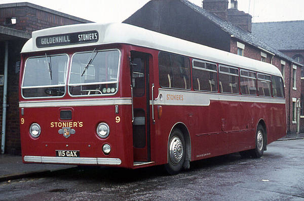115GAX was Stonier, Goldenhill 9 and had been acquired from Jones, Aberbeeg 115 in July 1966. It was a Leyland PSU3/3R Leopard new in April 1963 with a Willowbrook DP51F body and it passed to Berresford, Cheddleton in October 1980.