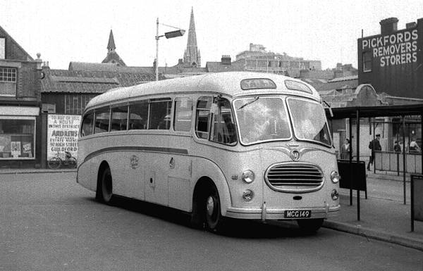 New in 1954 to Yellow Bus Services MCG149 was a Bedford SBO with Duple Vega C38F body and is seen in Onslow Street Bus Station, Guilford.