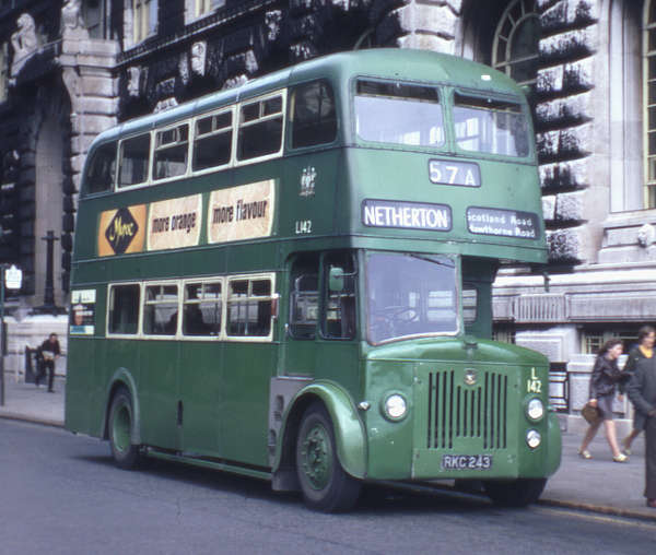 Liverpool Corporation L142, RKC243, a Leyland Titan PD2/20 built in 1954 with Alexander H32/26R bodywork.