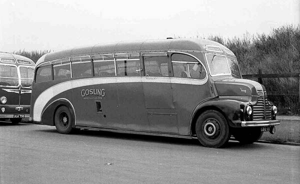 It had been delivered in 1949 as C28F, was upseated to C32F by mid-1954 and downseated to C28F again in early 1957. Gosling had had three earlier vehicles with Rainforth bodies - a Chevrolet in 1930, a Dodge in 1935 and a Leyland PS1/1 in 1948. GBE81 was sold in March 1960.